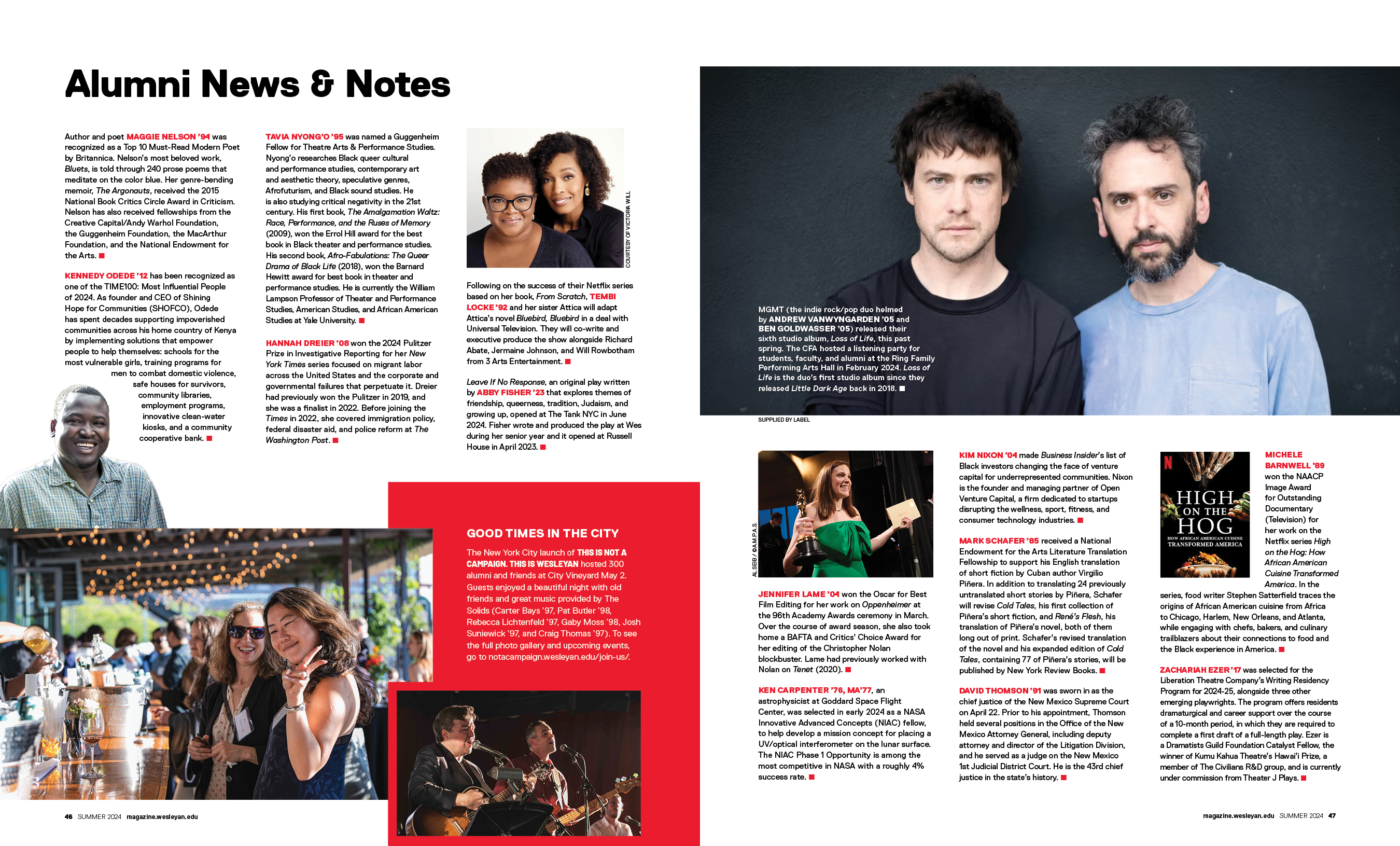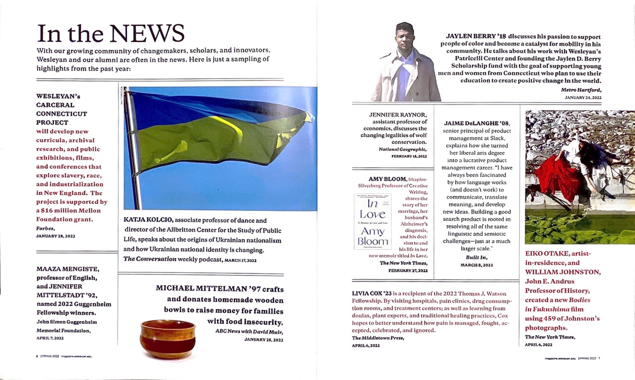 I created all of these spreads for the Wesleyan Magazine under the direction of the art director and with final approval given by the President of the University. This magazine is made up of 2 issues a year that get sent to alumni as well as one fully digital issue. Every magazine project involved a lot of collaboration and many rounds of critiques before going to print. For the story spreads, I was matched with a writer to discuss their story and possible design solutions for it. I managed about 90% of these spreads from conception until they were handed off to the art director for production.